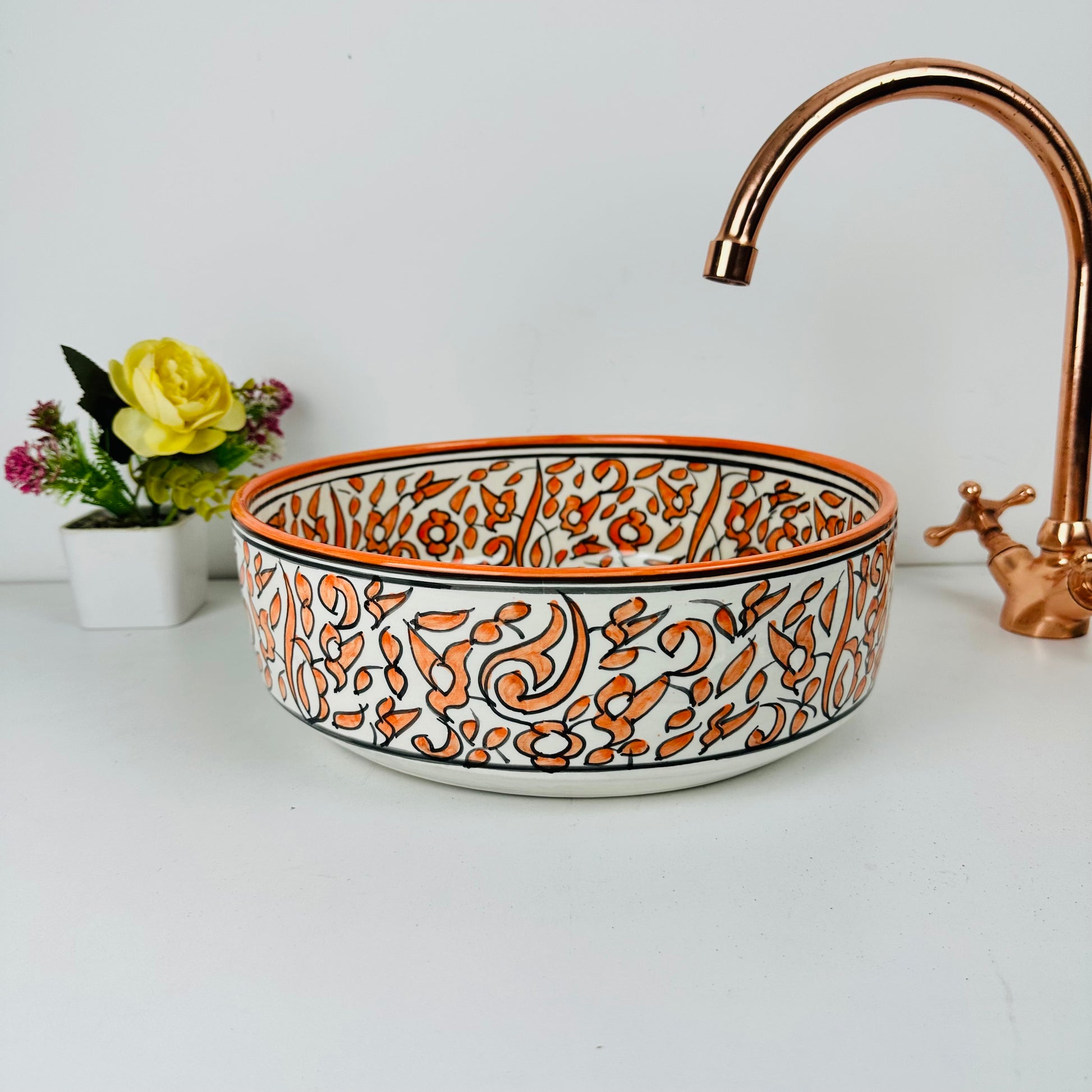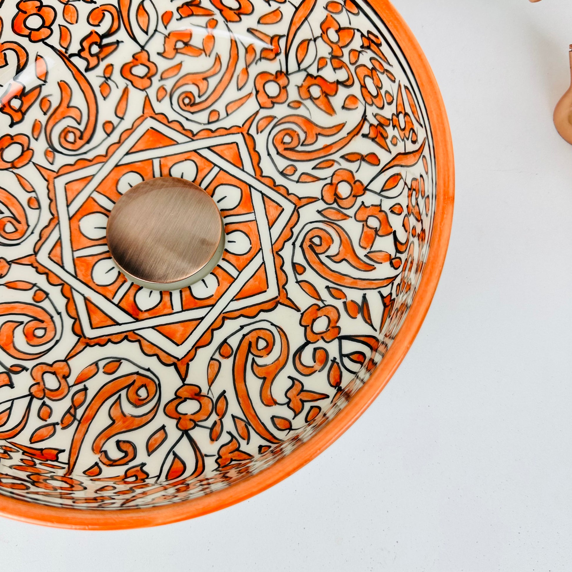 Brighten your bathroom with the vibrant charm of the Orange Blossom Vessel Sink. Featuring intricate, hand-painted floral patterns in lively shades of orange and warm red against a crisp white backdrop, this sink radiates warmth and creativity. Its bold yet elegant design is perfect for rustic, Mediterranean, or eclectic interiors.