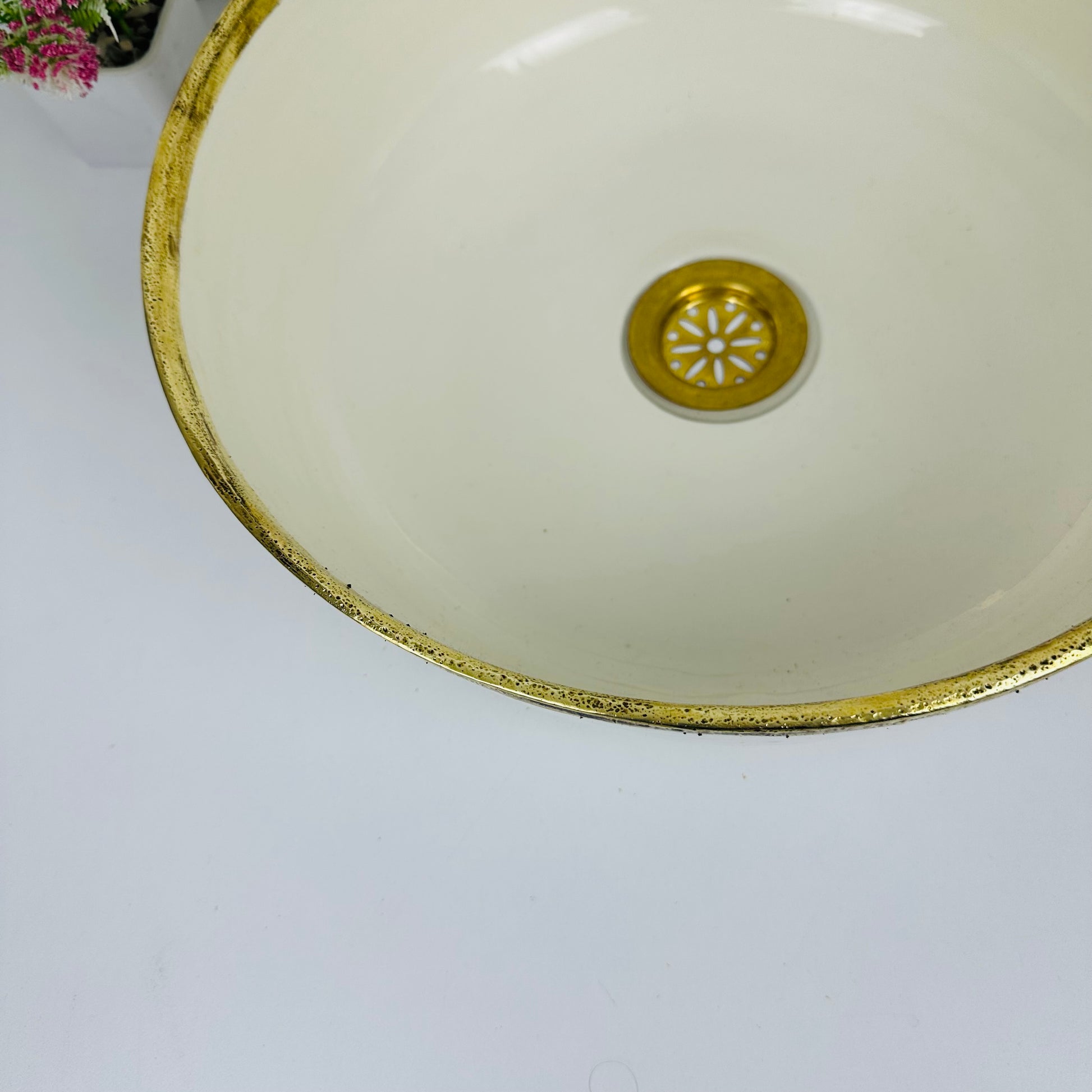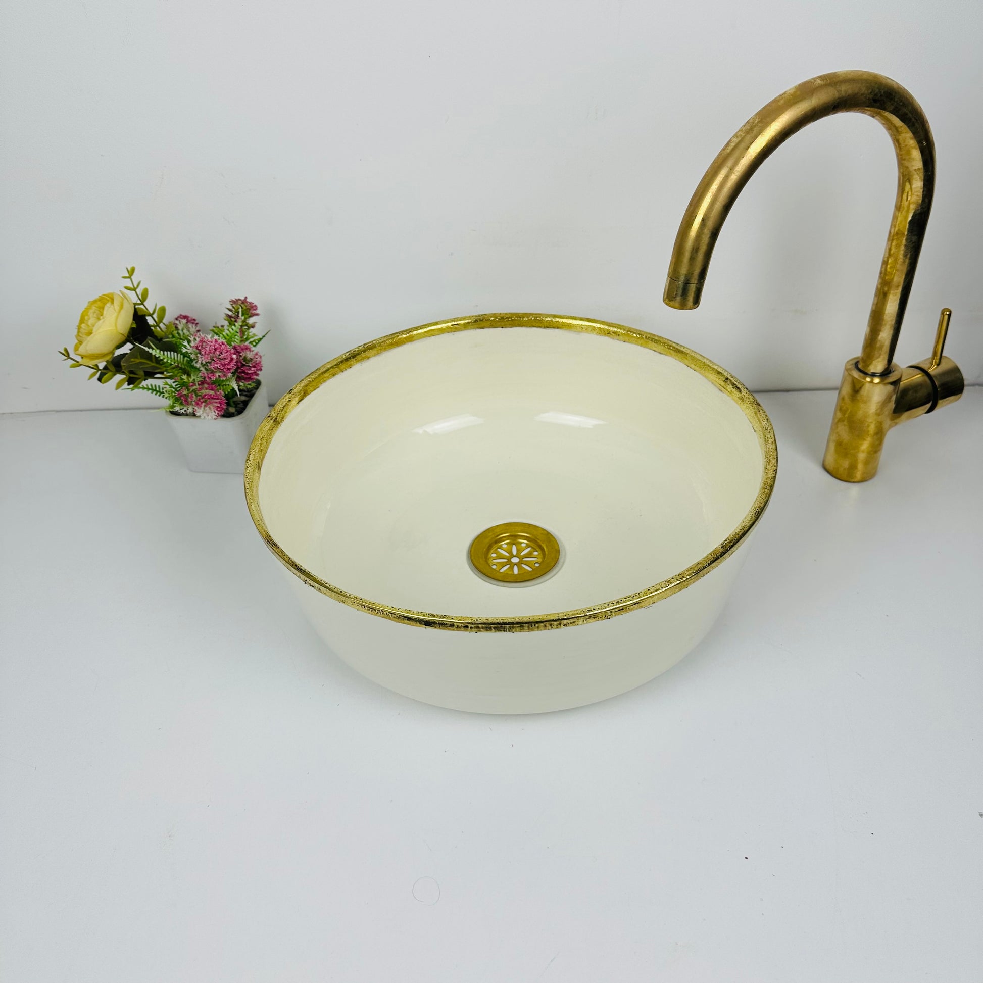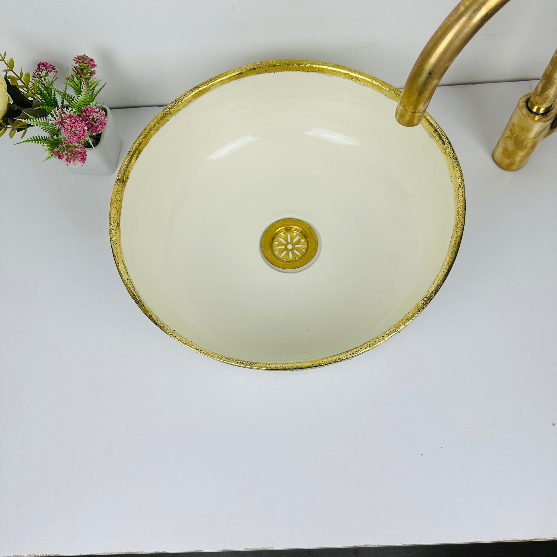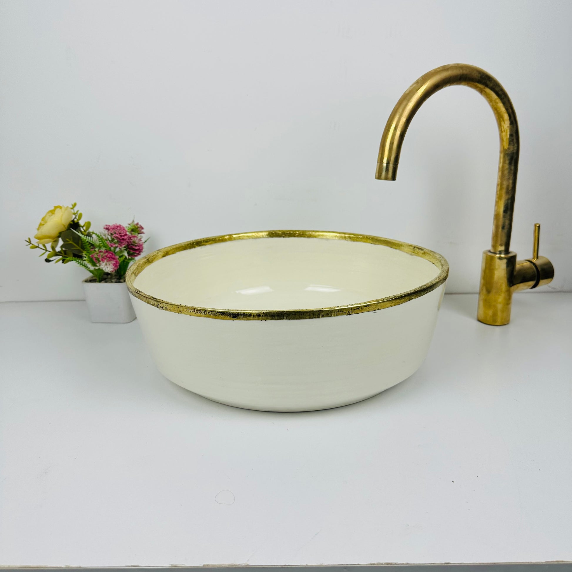 Timeless Elegance: Handcrafted Beige Ceramic Sink with Brass Accents