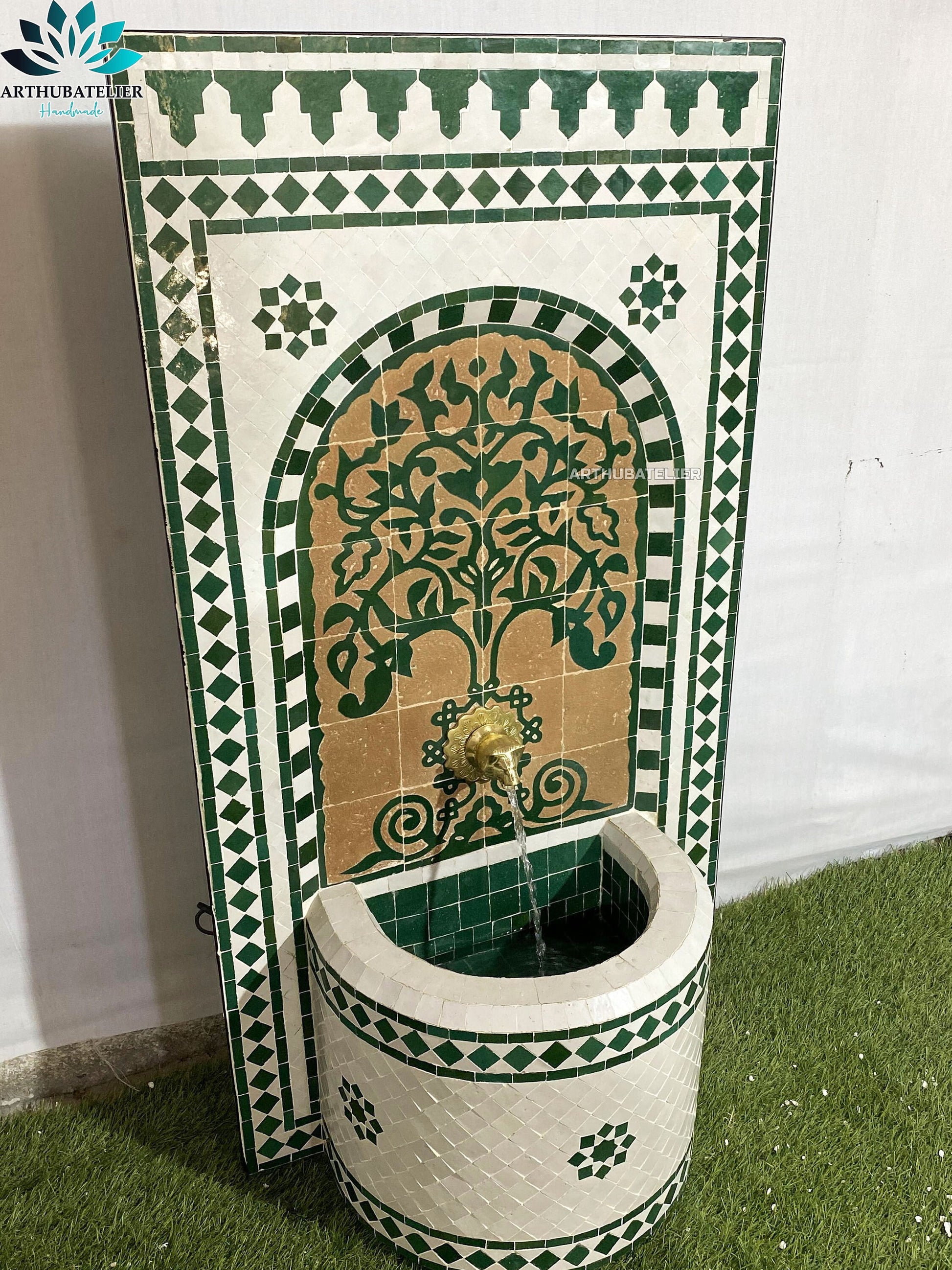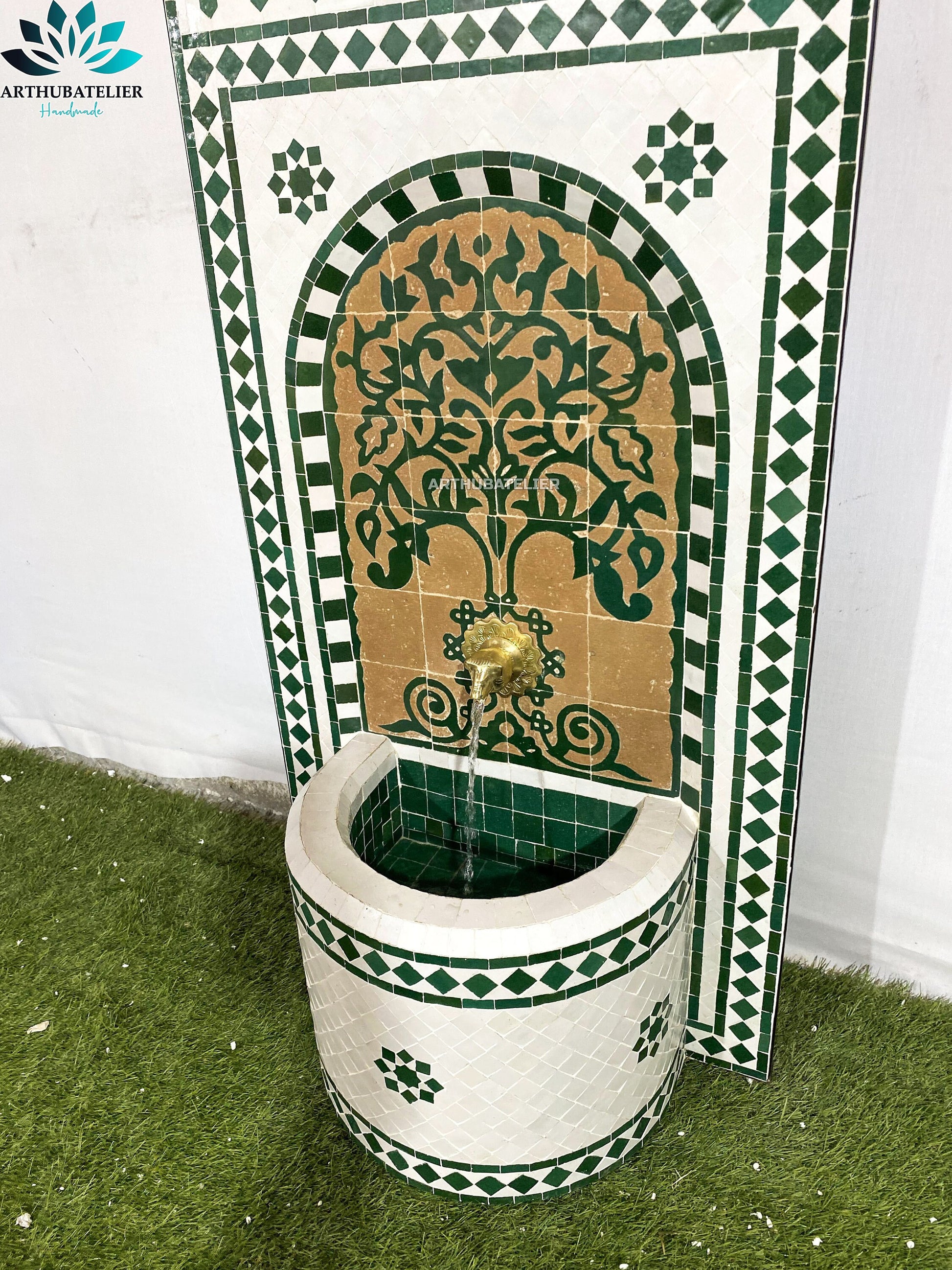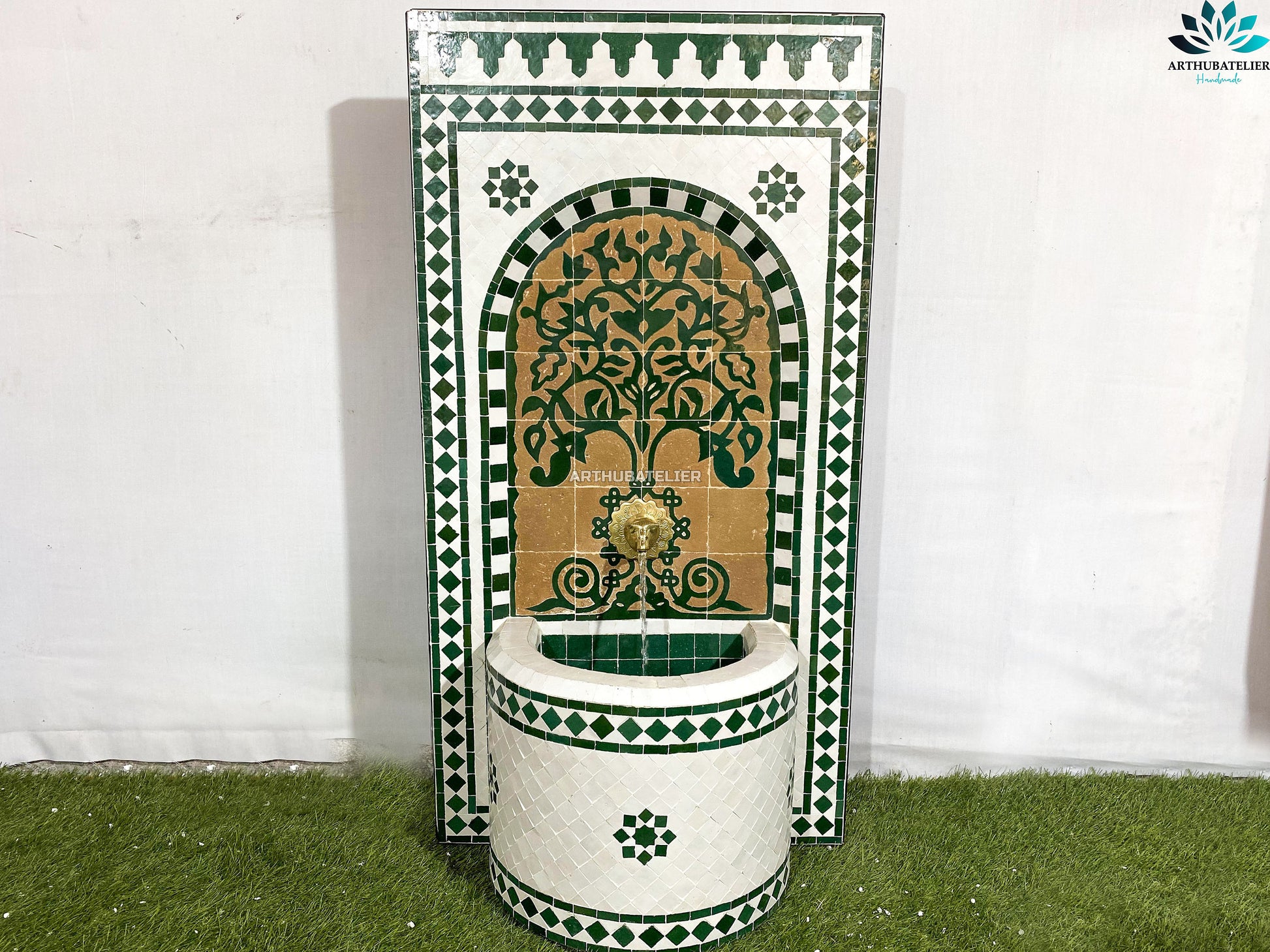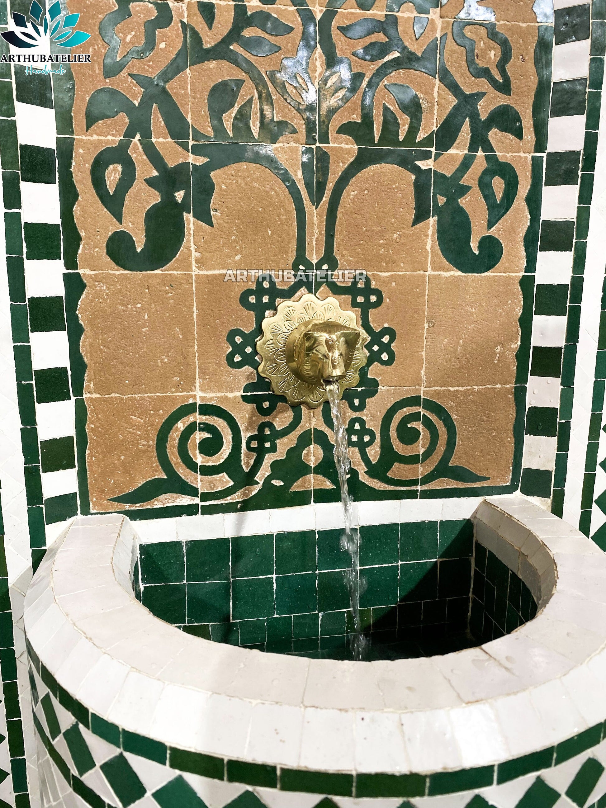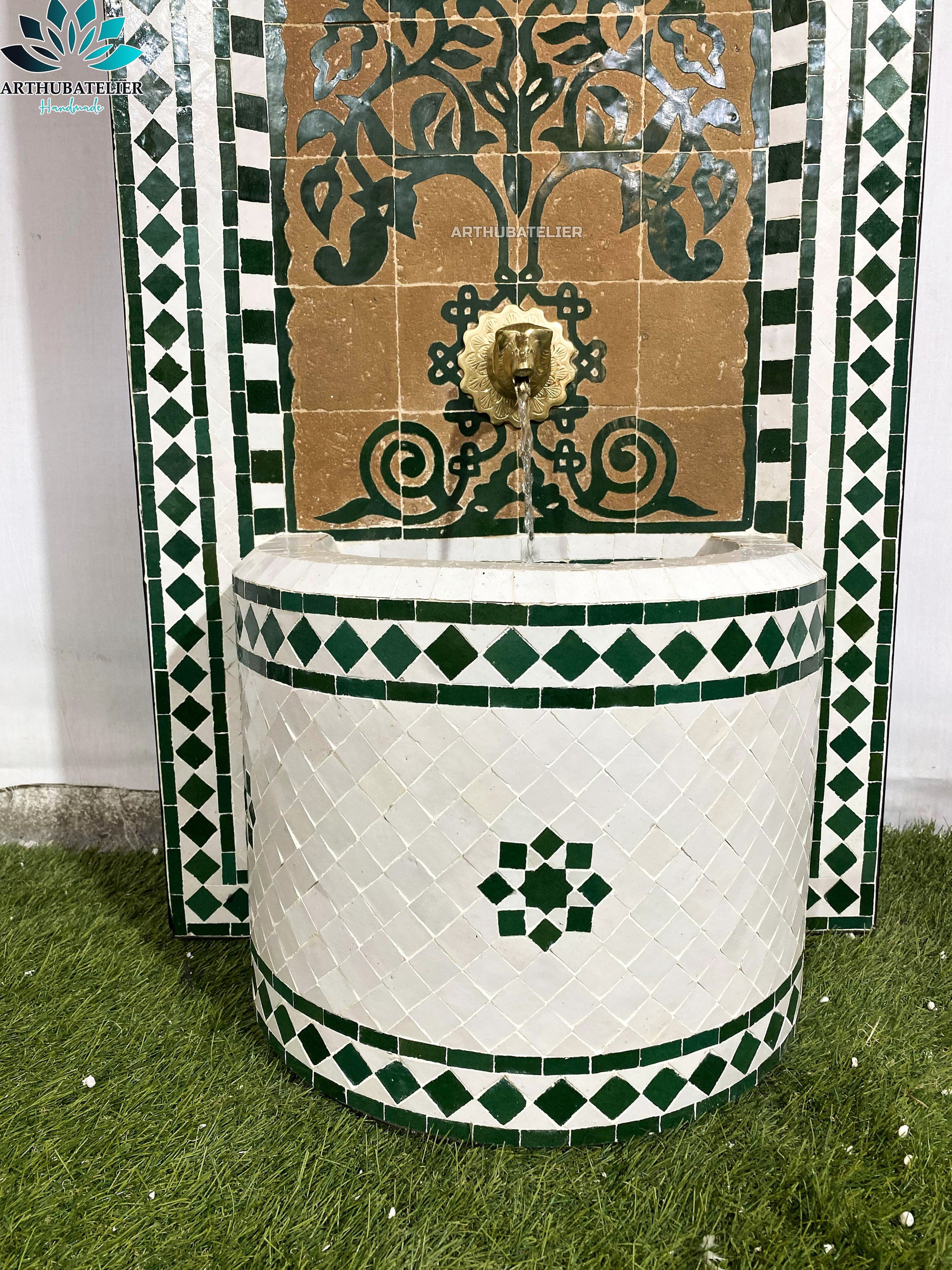 Elevate your space with this stunning Moroccan mosaic fountain, handcrafted with authentic Zellige tiles and a brass lion-head spout. The intricate floral motif in rich green and gold tones reflects the timeless beauty of Moroccan design, making this fountain a perfect decorative and functional addition to any setting.