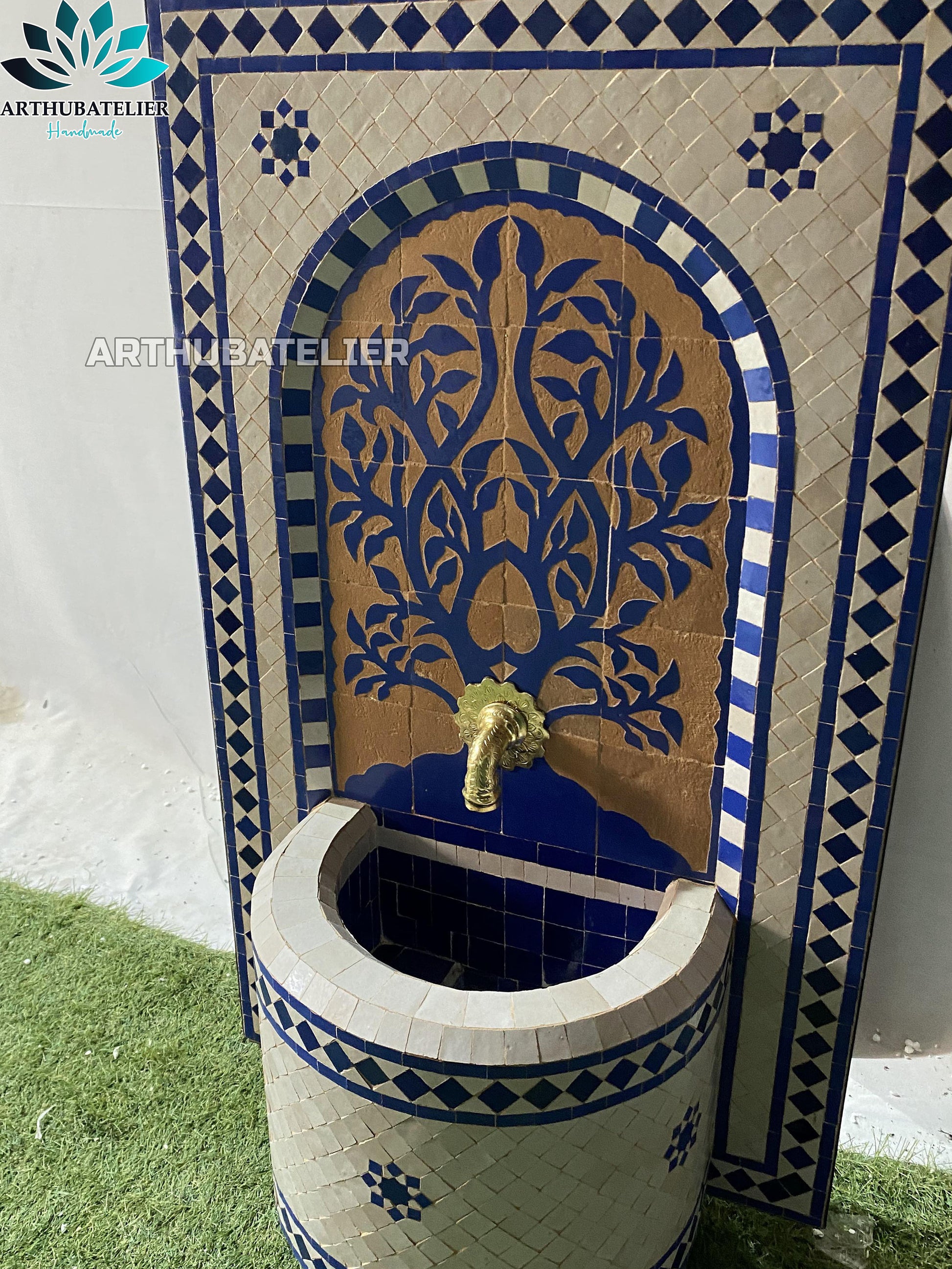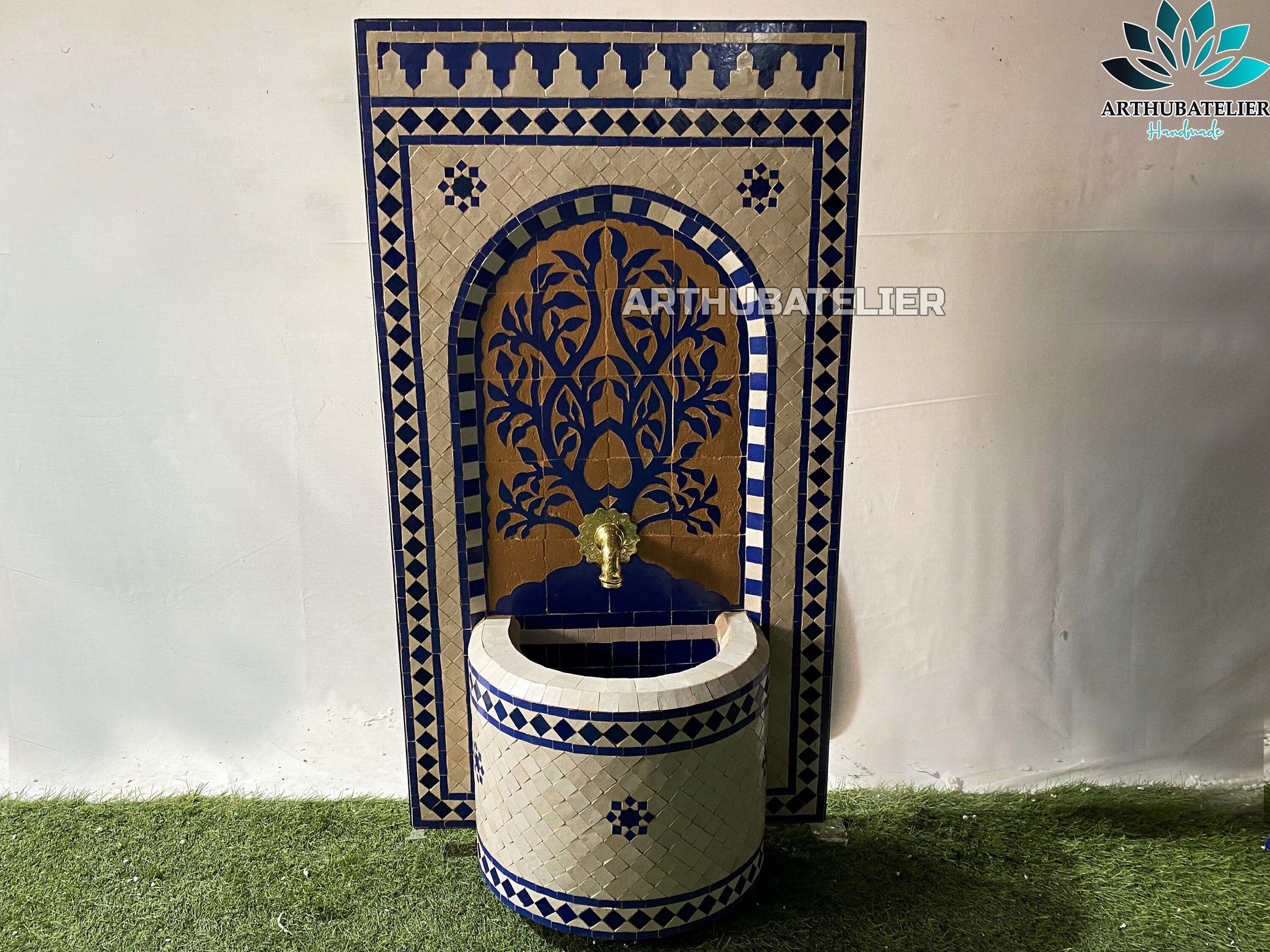 This elegant handmade Moroccan fountain features an enchanting Tree of Life motif, symbolizing growth and tranquility. The fusion of deep royal blue, earthy beige, and intricate Zellige tiles makes this fountain a stunning addition to any space, be it indoors or outdoors.