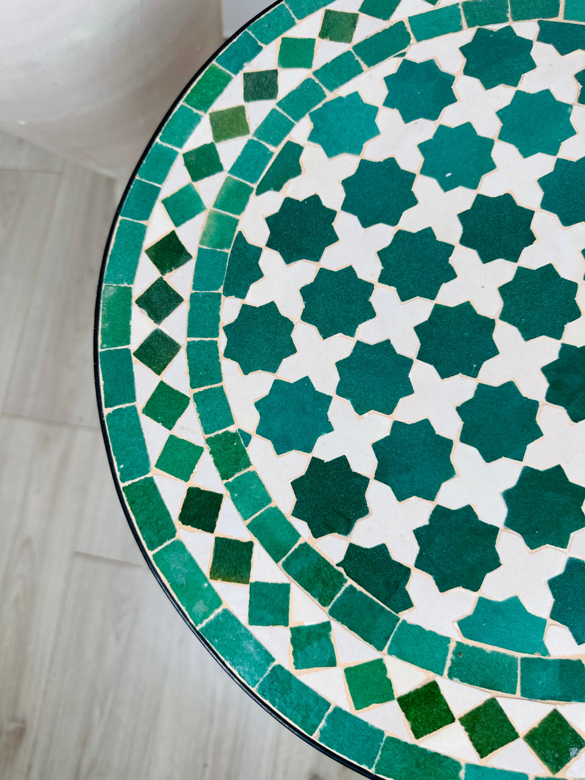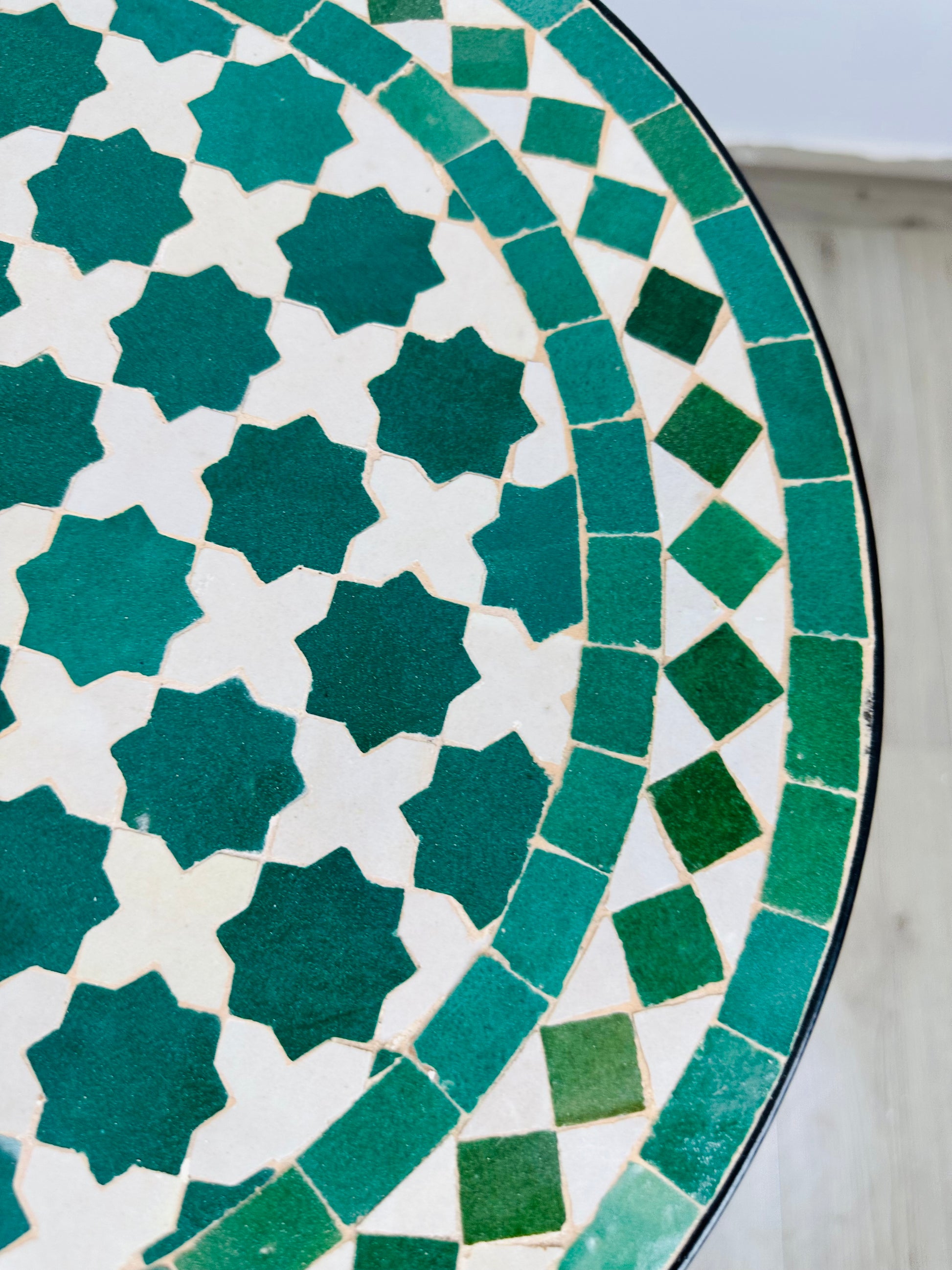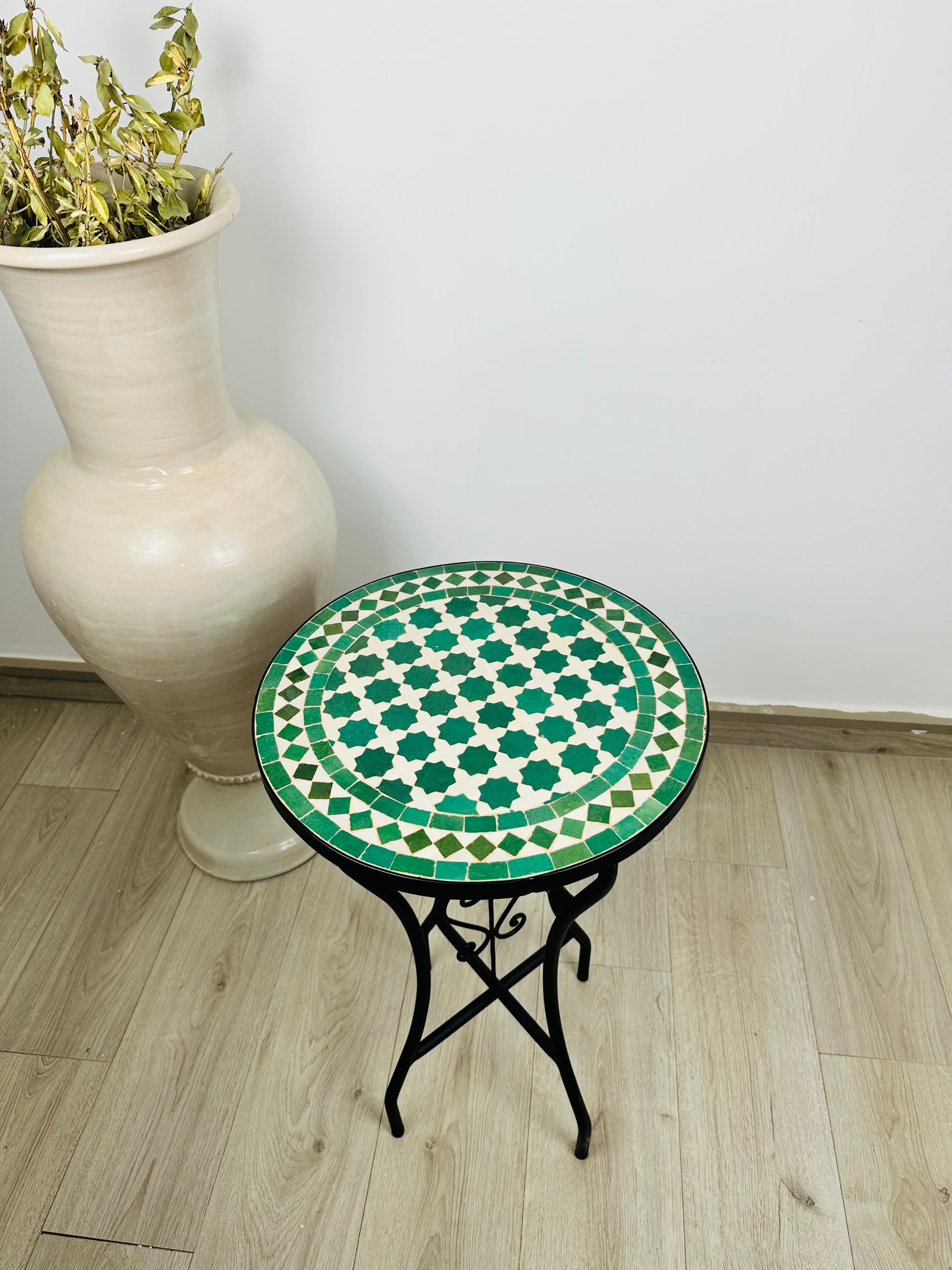 A charming addition to any patio, balcony, or indoor space, this handcrafted mosaic bistro table features an elegant green and white geometric pattern. The rich green tiles contrast beautifully with the crisp white accents, creating a timeless and versatile design. Its compact size makes it perfect for small spaces while still providing a stunning focal point.