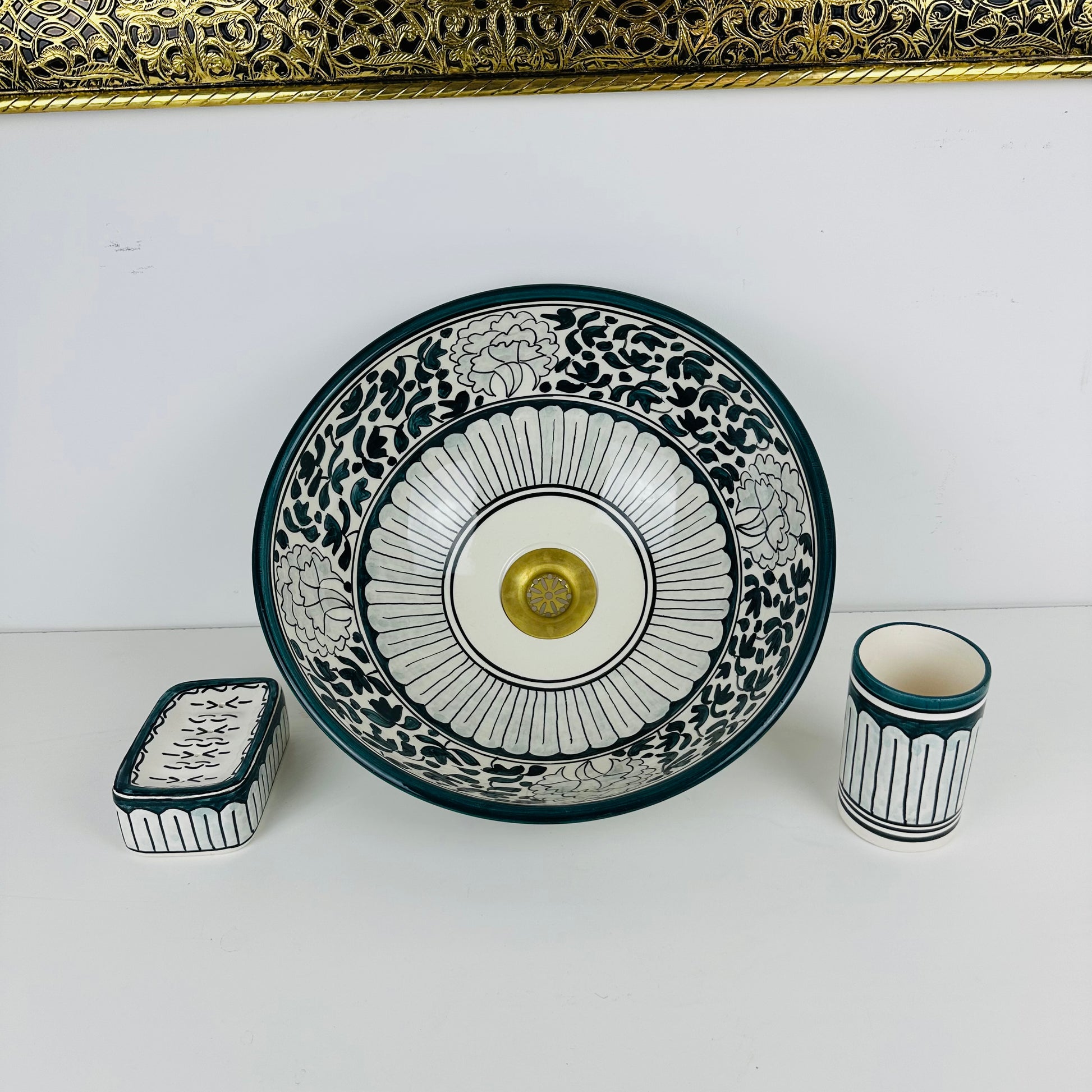 Verdant Bloom: Handcrafted Ceramic Sink with Dark Green Floral Motif