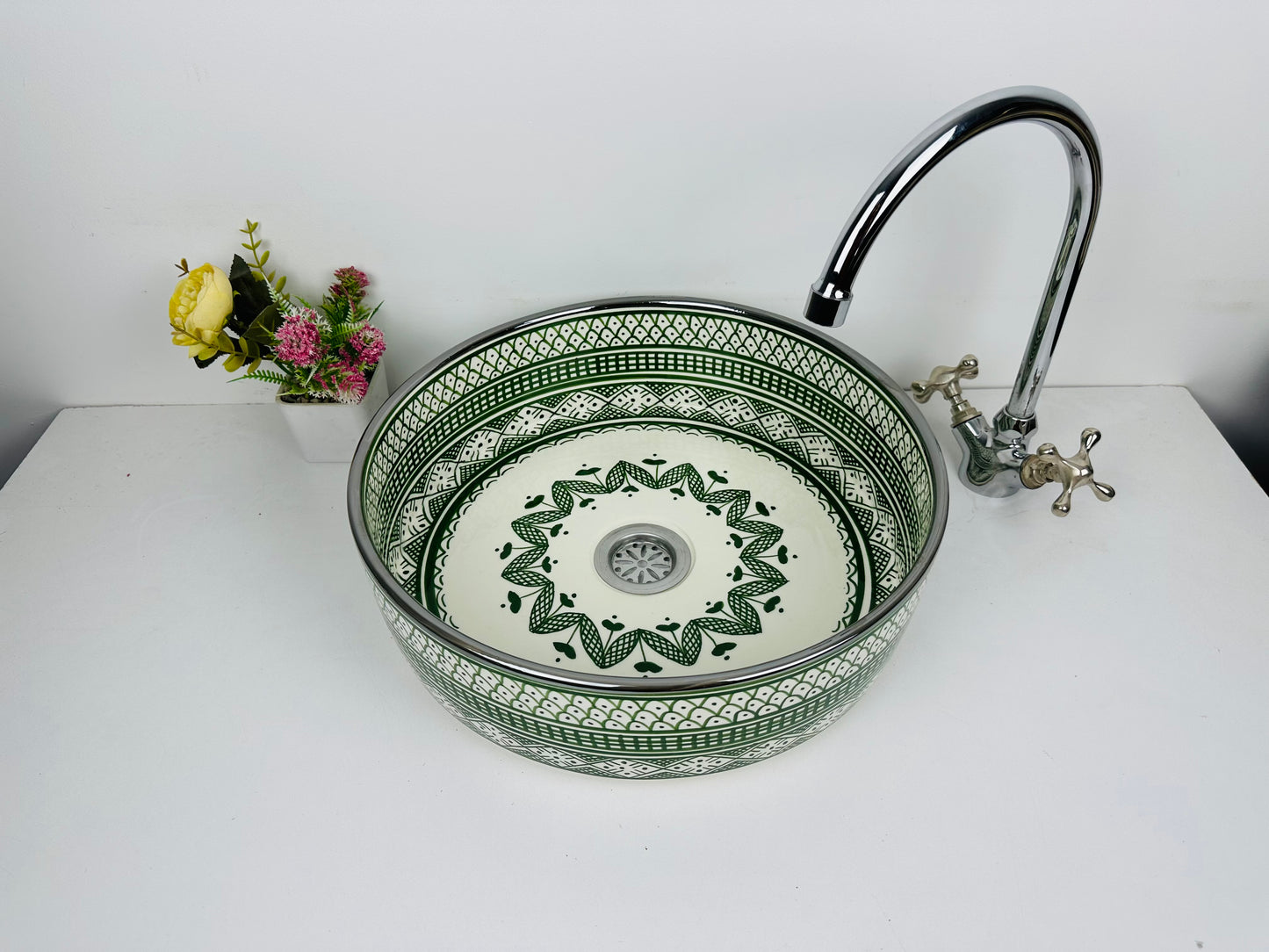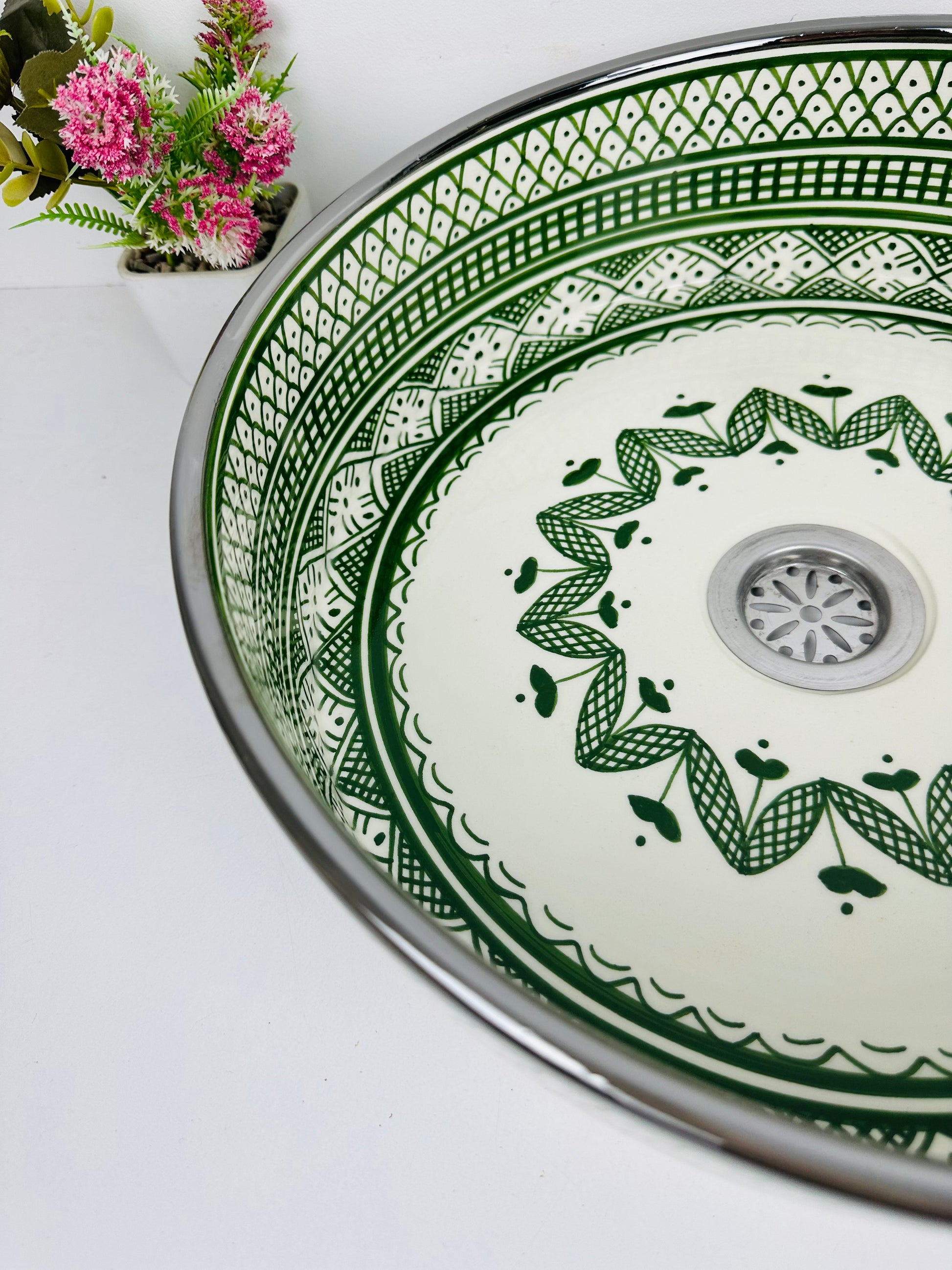 Woodland Elegance: Handcrafted Ceramic Sink with Traditional Forest Green Color and silver platinum