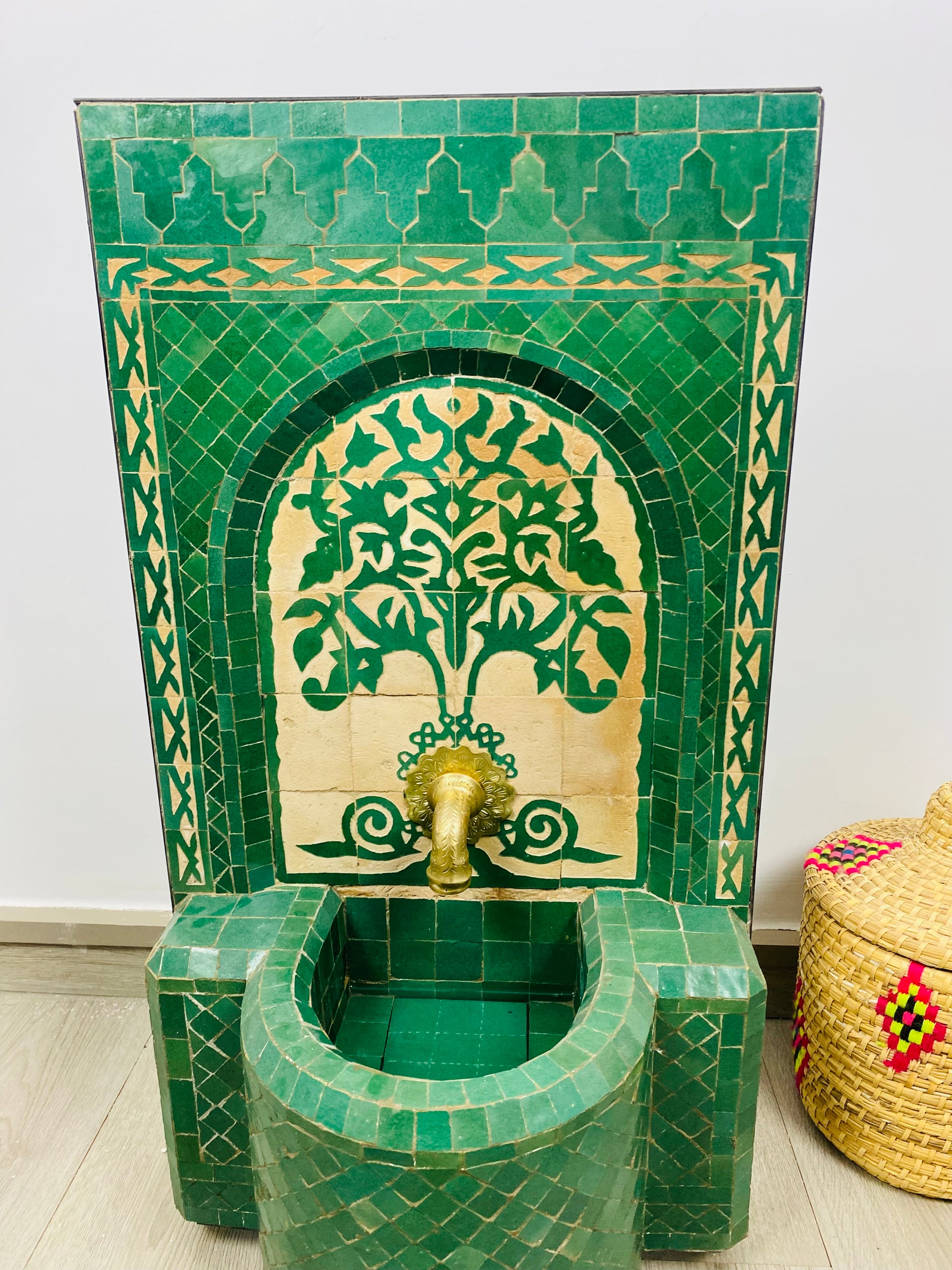 his exquisite Moroccan Zellige fountain features a deep green tilework with a stunning tree of life motif, symbolizing growth and harmony. The brass spout, shaped like a classic Moroccan faucet, adds an element of tradition, making it a perfect centerpiece for any space.